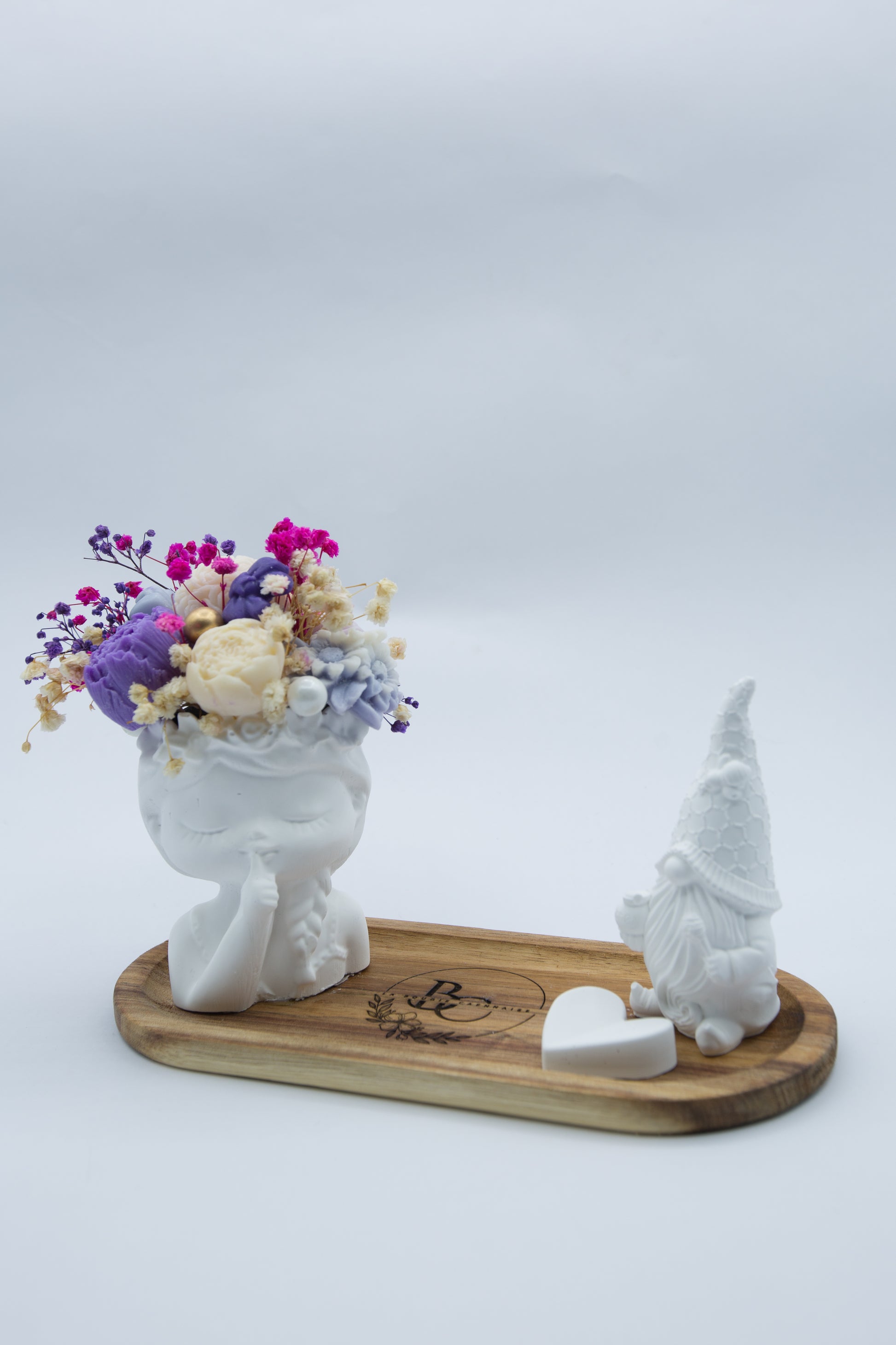 Il met en scène une figurine délicate ornée d’un bouquet de fondants parfumés aux couleurs vibrantes, ainsi qu’un petit personnage décoratif, le tout posé sur un plateau en bois naturel.